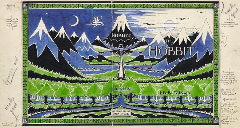 Before the story begins, we are greeted by the cover. There are many different covers to The Hobbit now, but when it was first publish, Tolkien’s own design was on the dustjacket (pictured below). What did Tolkien, as author and illustrator, choose for the border, the literal frame, of the picture? A continuous line of dwarvish runes. Starting at the bottom left corner, they translate to “The Hobbit or There and Back Again, being the record of a year’s journey made by Bilbo Baggins; compiled from his memoirs by J.R.R. Tolkien and published by George Allen & Unwin…”