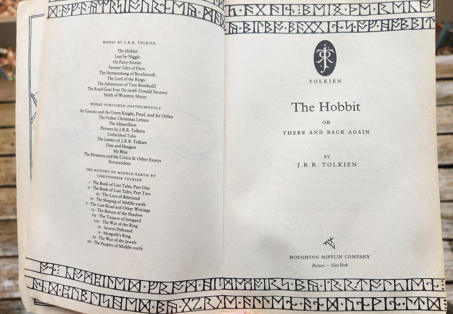 Finally, just before chapter one begins, we have Tolkien’s own note on the text written by a translator introducing a work of translation. This note is titled in runic letters which translates to, “The Hobbit, or, There and Back Again.” The reader is again confronted with a foreign language and, very importantly, Tolkien here gives the reader the means to translate it. The reader is invited to participate in the translation. In this note, Tolkien also addresses the reader as though a linguistic scholar (or philologist in T’s case) was prefacing a work of translation for his peers. He provides a brief explanation of linguistic anomalies and translation difficulties as well as any history or similar information that the reader might need to make sense of what follows. I own a book of Old English poetry translations which have similar introductions to each poem. Tolkien, as an actual translator, brings that tone of scholarly translation to his work of fiction.